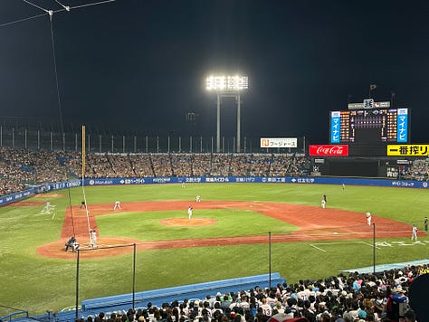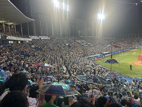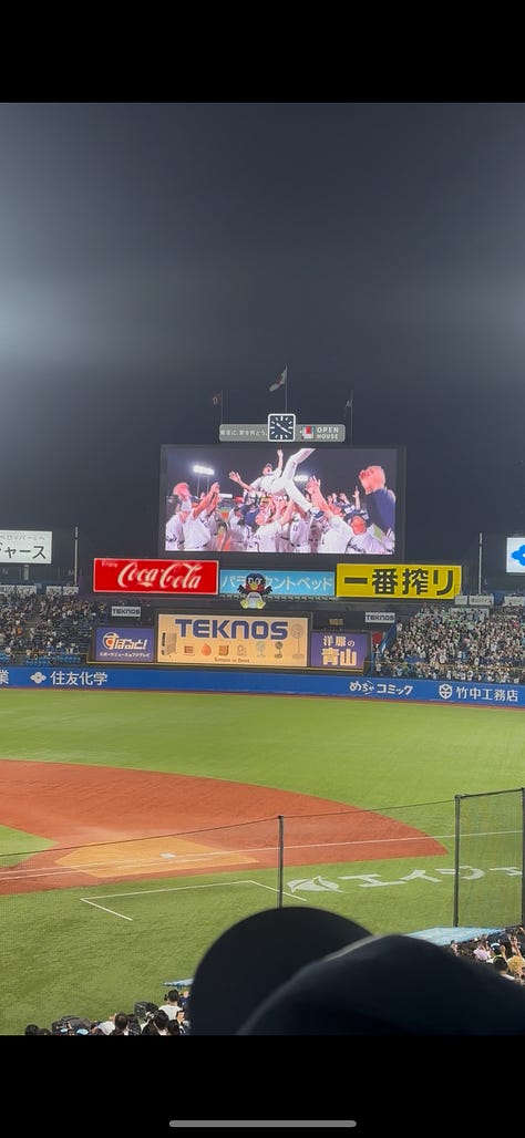 The night, however, is what likely held my favorite memory of Tokyo. After being distraught thinking I missed the season, I attended a game between the Tokyo Yukult Swallows vs the Tokyo Yomiuri Giants. The Swallows play at Meiji Stadium, a venue built in 1926 which Babe Ruth once played in. There is only one level of seating, yet the energy from the fans could’ve filled Yankee Stadium. It was remarkable. Every player had their own individual chant (some choreo too). There was an away section (filled to the brim due to it being a crosstown rivalry game), and they had their own cheers, going back and forth with the home fans like it was a Premier League match. Truly, there wasn’t a dull moment, and even better, everyone was dialed into the game. Nobody was sitting around chatting, swiping on their phone due to baseball being “boring.” It was pure excitement. My favorite part was whenever the Swallows scored, the whole stadium would put up these beautiful glittering umbrellas and twirl them around. It was a sight. Best part was what a great game we got! The Swallows are the worst team in the league playing the financial juggernaut equivalent of the Yankees and yet it was a shootout: tie game, 4-4, that went into the 12th inning!! Unfortunately NPB rules state a game ends in a tie after the 12th (lame), so it ended there. Turns out it was the final home game of the season and the manager was retiring, so afterwards everyone stuck around for speeches, a flower ceremony, season highlight montage, and a final celebration where the players tossed the manager up in the air like a rockstar while the crowd erupted in cheers.